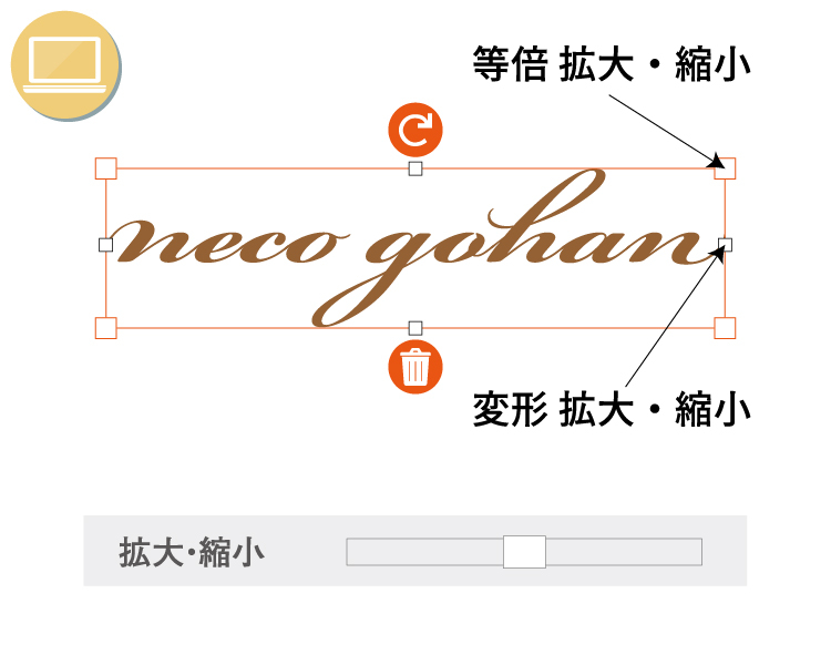 ①サイズを変更したいデザインを選択→メニューに表示される「大きさ」の真ん中にある四角をクリックしたままマウスを左右に動かしてください