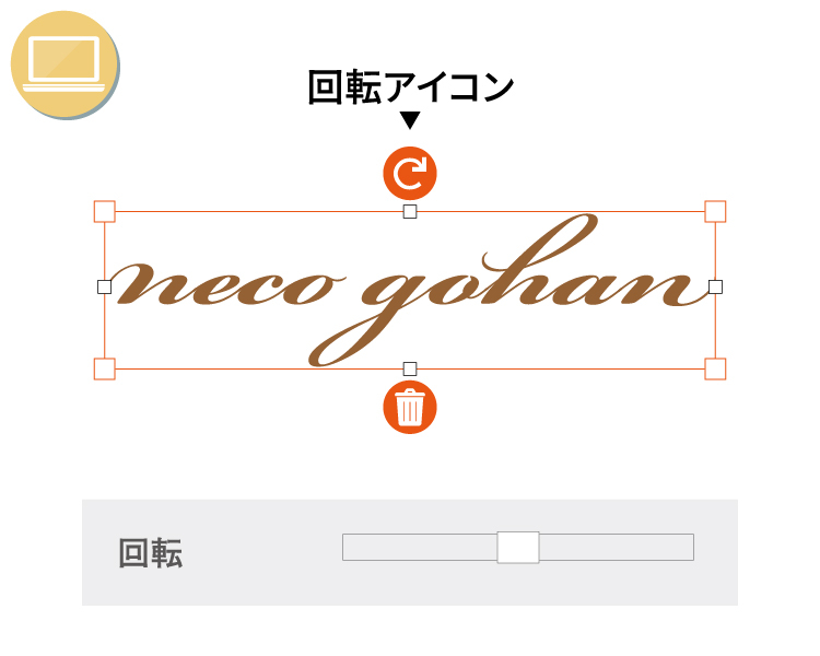 選択したデザインの上にある『回転アイコン』をクリックしても回転ができます。「shift」キーを押しながら動かすと45度ずつ回転します