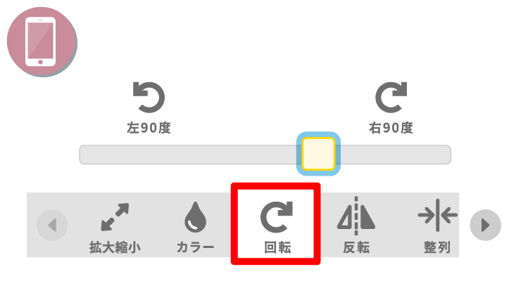 回転させたいデザインを選択し、メニューに表示される「回転」の真ん中にある四角をクリックしたままマウスを左右に動かしてください